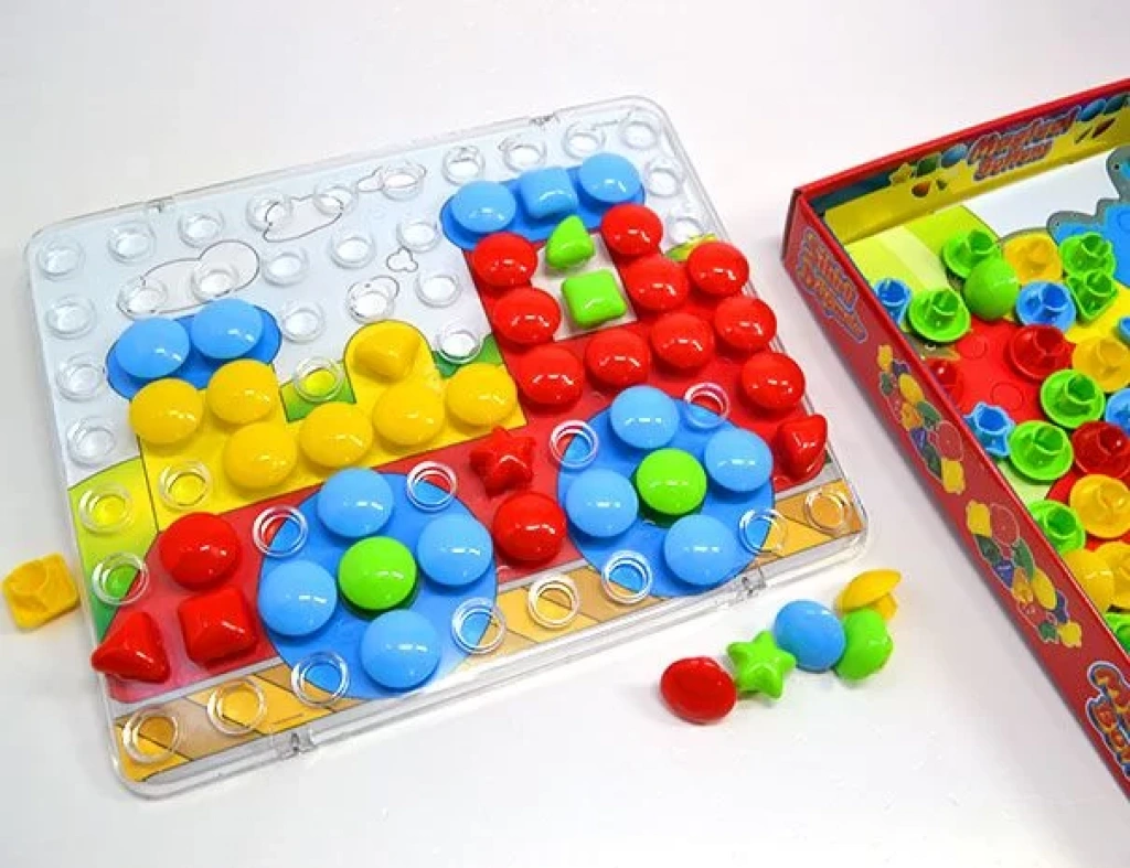 Sihirli düğmeler 3 yaş ve üzeri çocuklar, “sihirli düğmeler” sayesinde, ilk güzel mozaik desenlerini 80 adet büyük kırılmaz düğmeyi, şeffaf saha ya takarak kolayca oluşturabilirler.