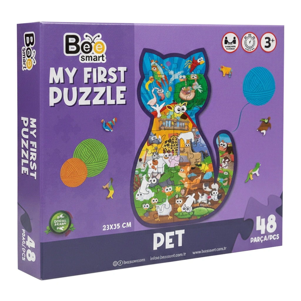 Sevimli dostlarımızın dünyasına keyifli bir yolculuk! Bee Smart My First Puzzle Pet, minik hayvanseverleri dev bir kedi formundaki özel çerçeve içerisinde evcil hayvanların renkli dünyasıyla buluşturuyor. Büyük parçalı yapısı ve özel kesimiyle çocukların ilk yapboz deneyimini başarıyla tamamlamalarını sağlayarak özgüvenlerini geliştirir.