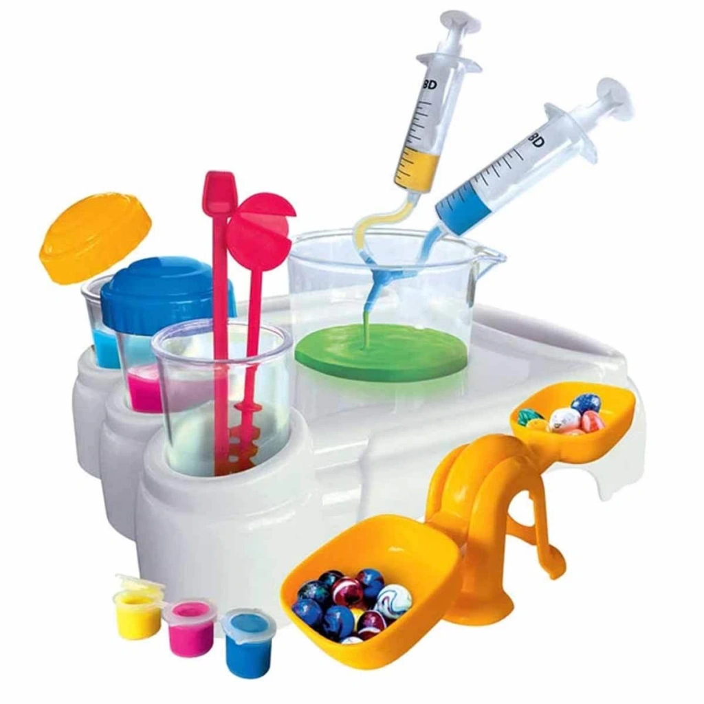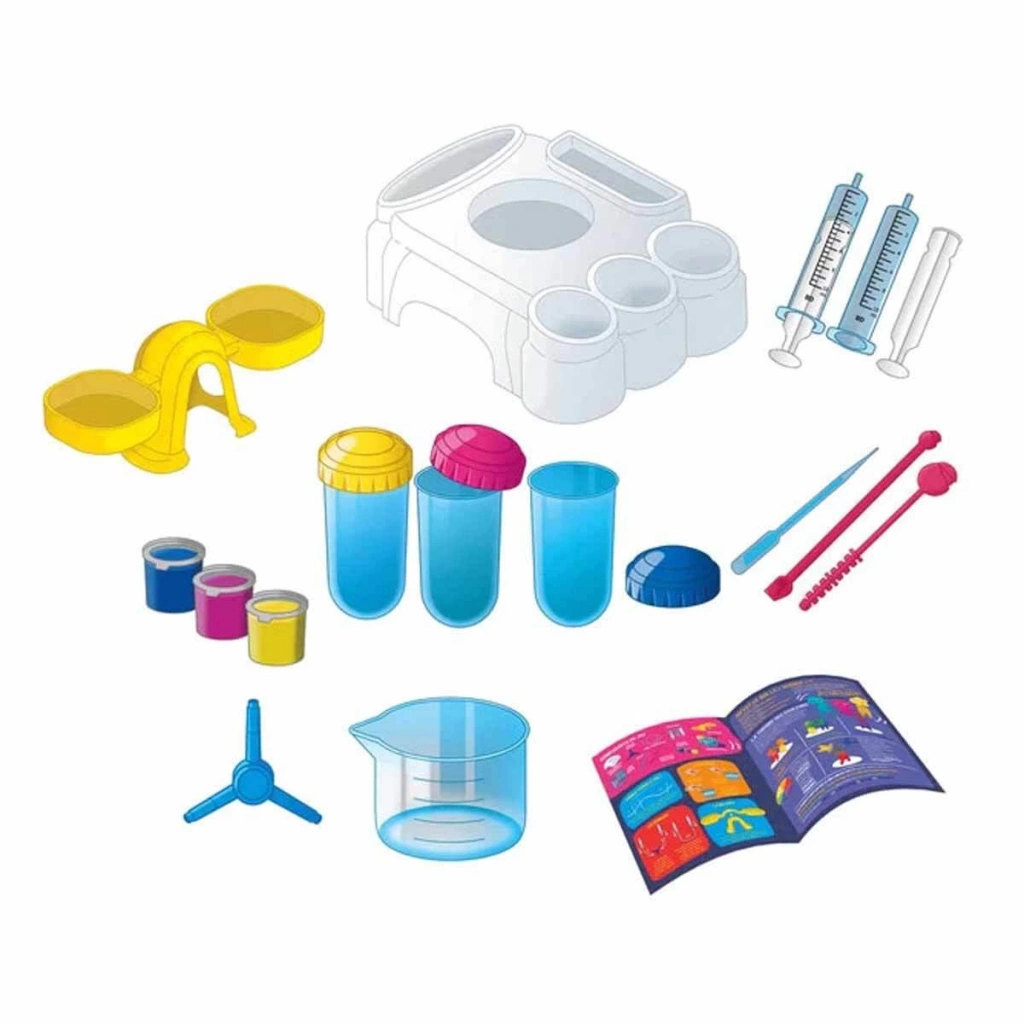 Kutu içerisinde; deneyler için çalışma tezgahı, terazi, tıpalı deney tüpleri, renklendiriciler, üç yönlü yönlendirici, kaşık, şırıngalar, şeffaf plastik tüp, dereceli deney kabı, karıştırıcı, pipet ve resimli kullanım kılavuzu bulunmaktadır.