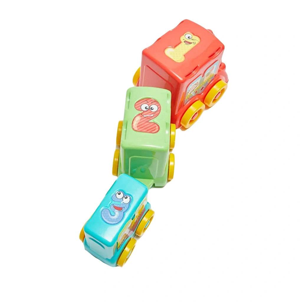 3 Renkli Vagon: Pembe lokomotif, mavi ve yeşil vagonlardan oluşan, birbirine kolayca takılıp çıkarılabilen modüler yapı.