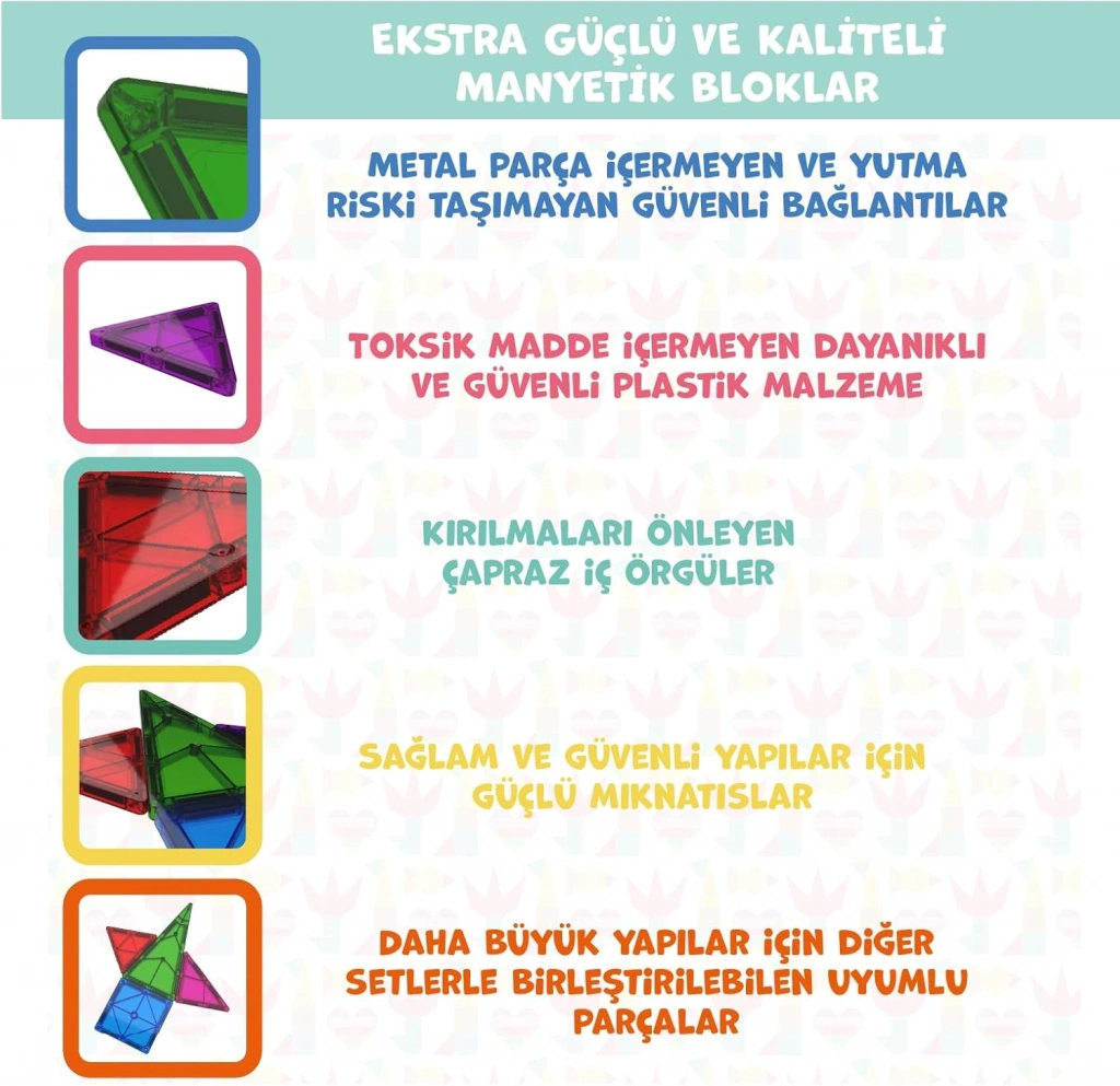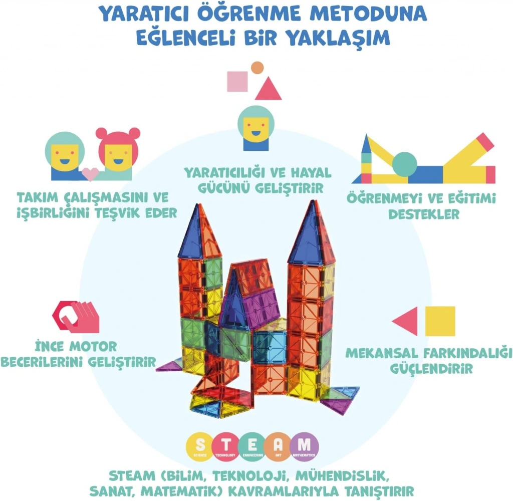 Çocuklar rengarenk blokları mıknatıslı olması sayesinde kolayca bir araya getirerek diledikleri yapıyı oluşturabilirler.