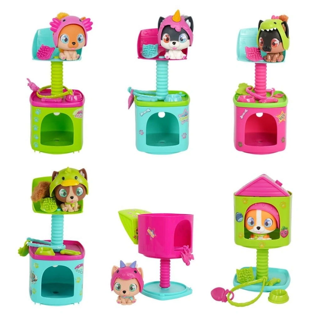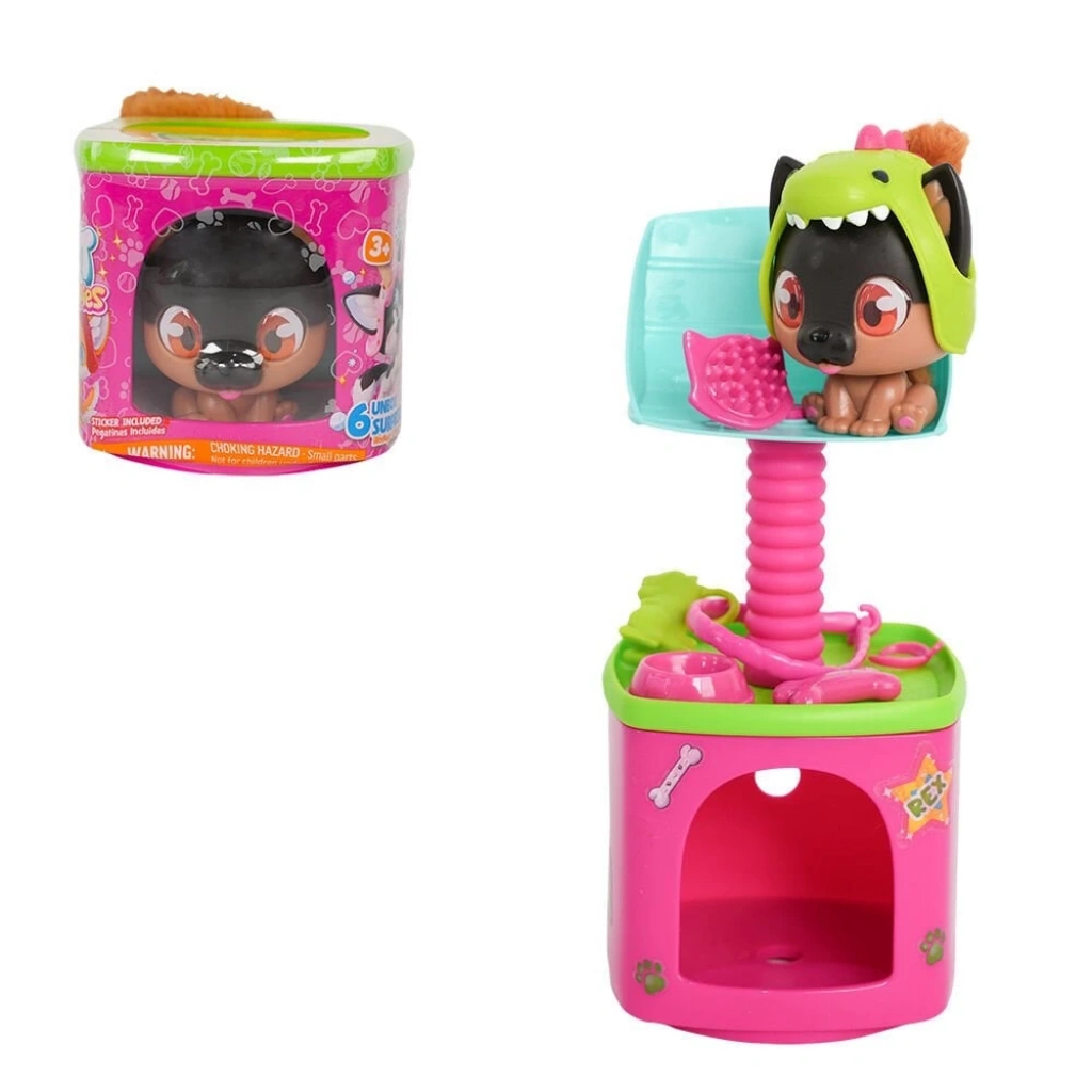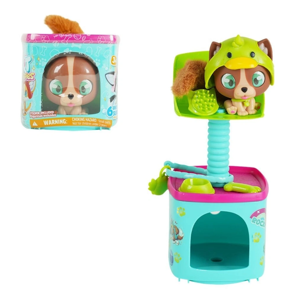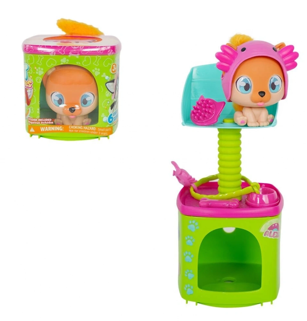Set içerisinde: 1 adet yavru köpek, köpek evi, 6 aksesuar, çıkartma kağıdı ve koleksiyon kağıdı içerir.