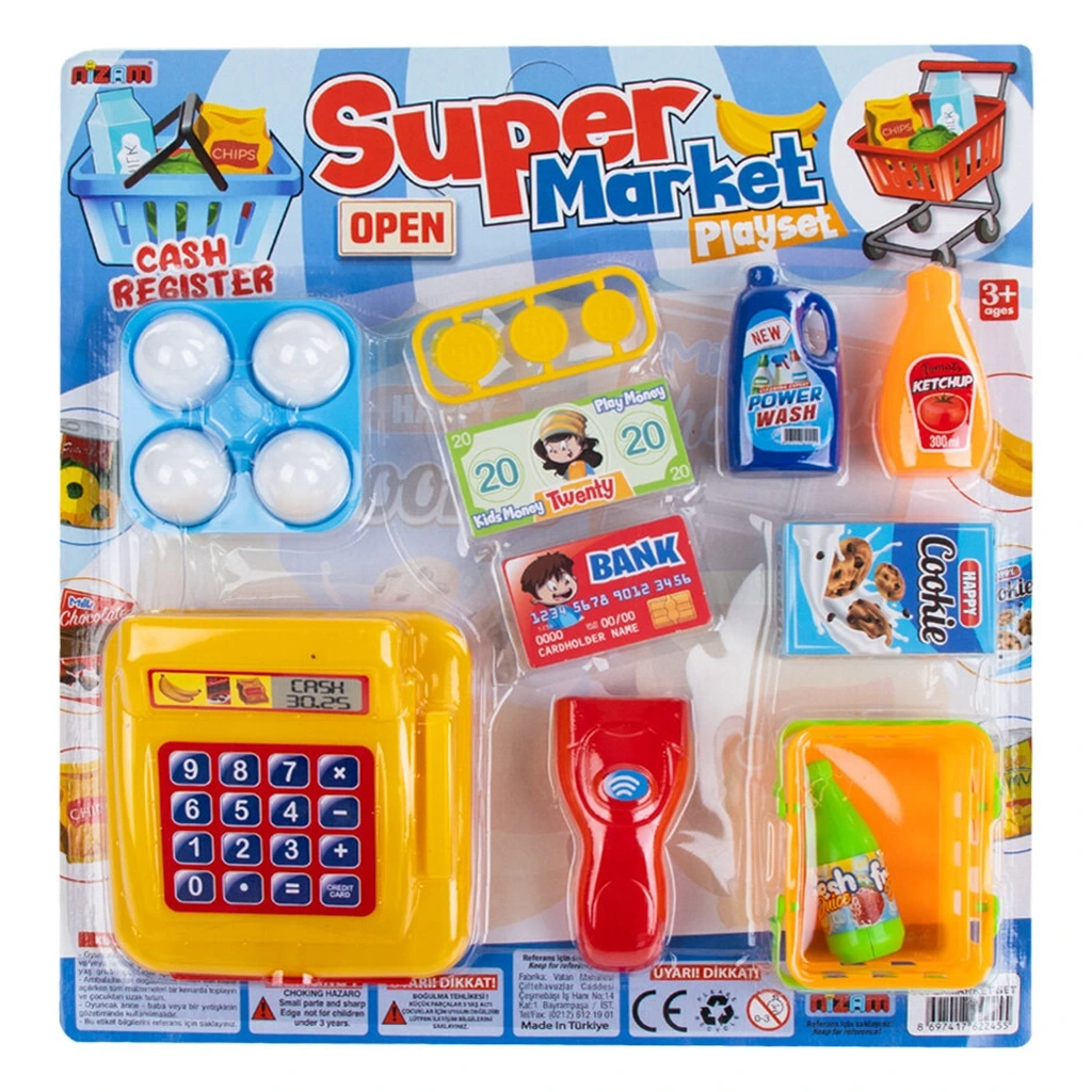 İçerisinde mini alışveriş arabası, kasa, market ürünleri ve kasiyer ekipmanları gibi süpermarket ortamına uygun aksesuarlar yer alır.