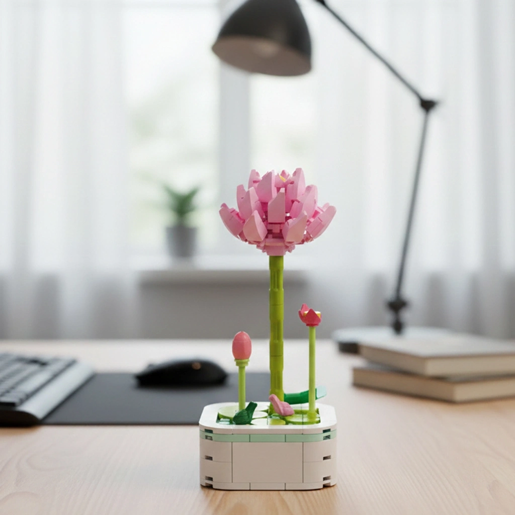 Zarif Lotus Tasarımı: Çiçeğin açmış halini ve yanındaki tomurcukları temsil eden gerçekçi, çok katmanlı yapı blokları.