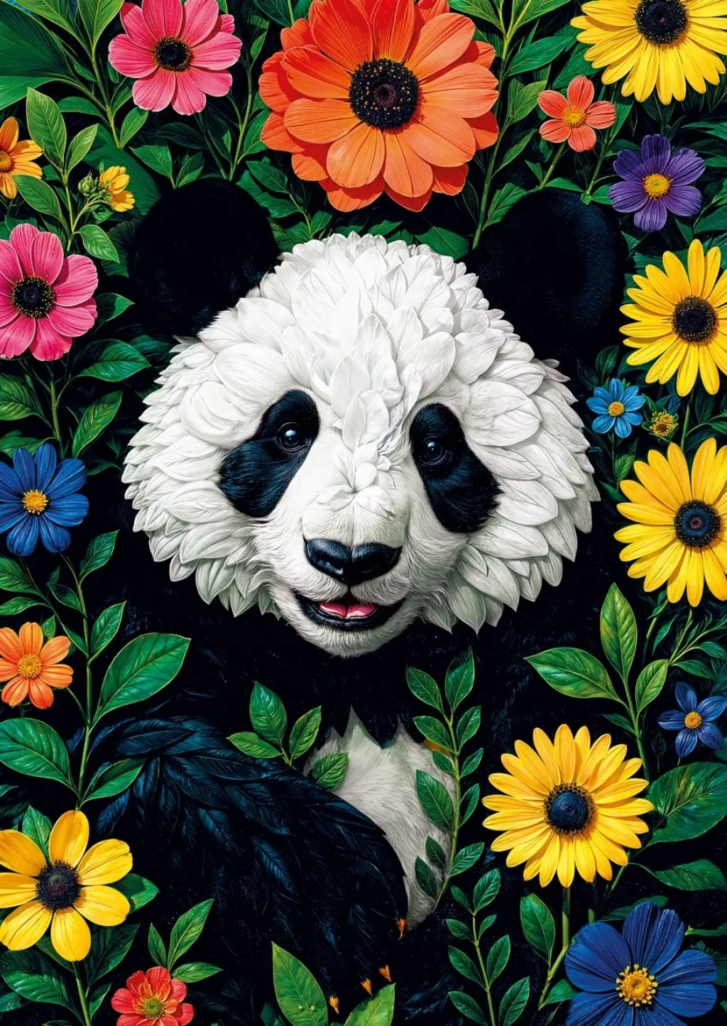 Büyüleyici Kontrast: Pandanın monokrom renkleri ile çevresindeki canlı çiçeklerin yarattığı eşsiz sanatsal denge.