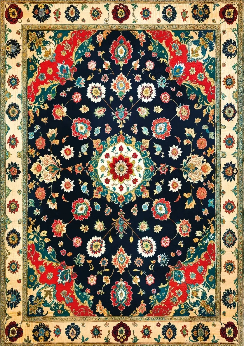 Zengin ve Detaylı Motifler: İnce işlenmiş çiçekler, geometrik şekiller ve klasik bordürlerle dolu, yüksek çözünürlüklü sanatsal görsel.
