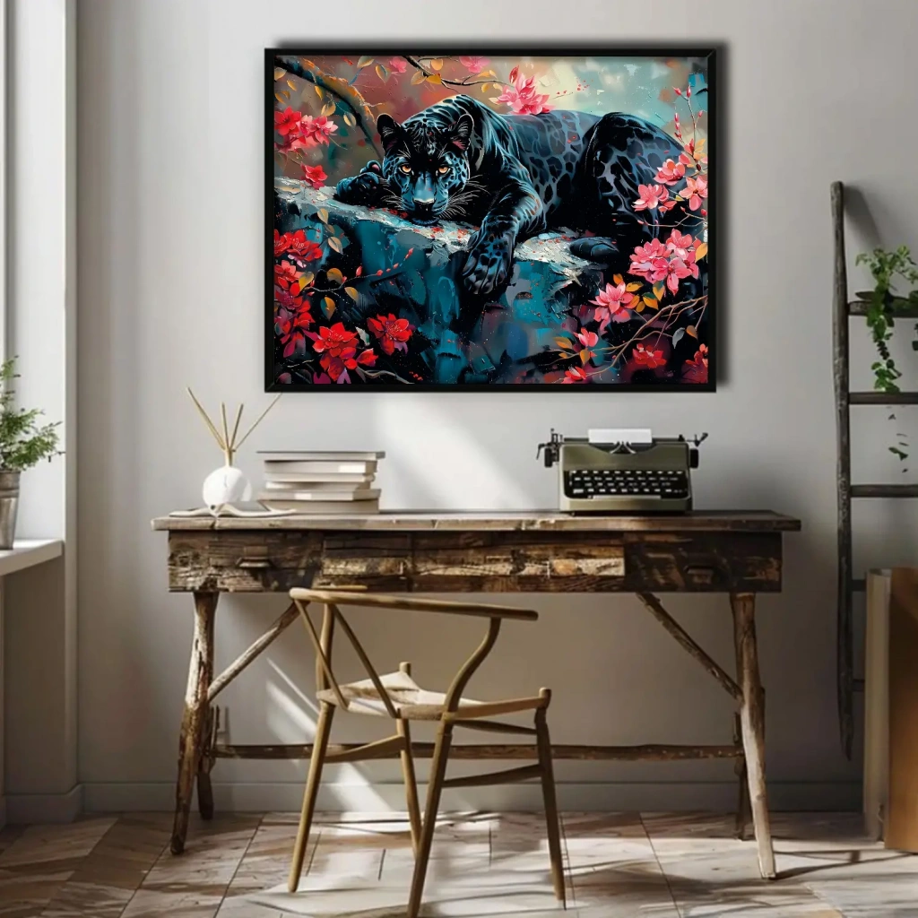 Büyüleyici Vahşi Doğa Tasarımı: Kaplanın bakışlarındaki derinlikten, suyun üzerindeki yansımalara ve tropikal bitki detaylarına kadar ustalıkla işlenmiş sanatsal illüstrasyon.