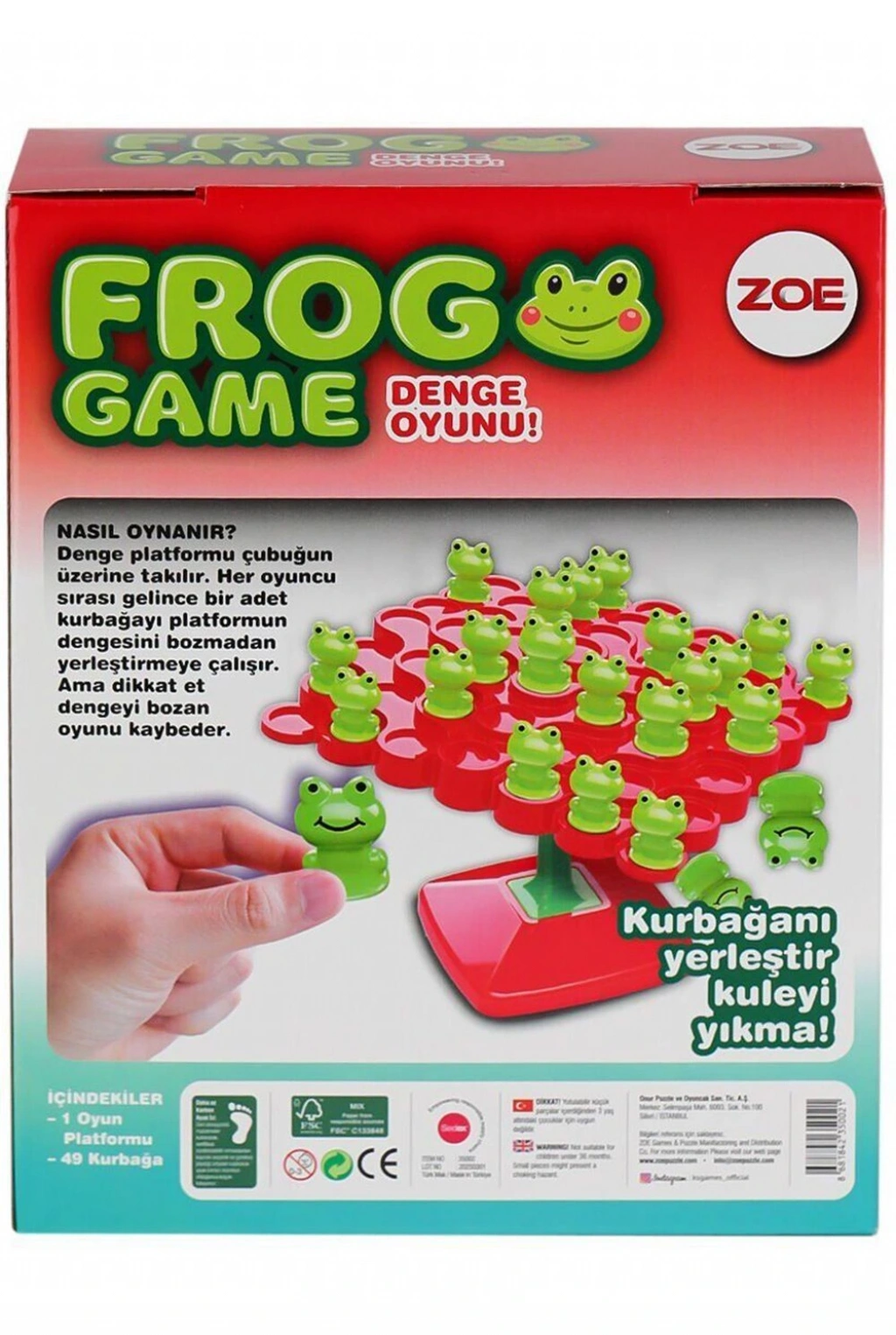 Denge platformu çubuğun üzerine takılır. Her oyuncu sırası gelince bir adet kurbağayı platformun dengesini bozmadan yerleştirmeye çalışır. Ama dikkat et dengeyi bozan oyunu kaybeder.