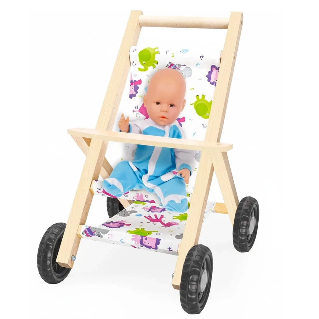 Çocuklar için tasarlanmış ahşap bebek arabası oyuncağıdır.