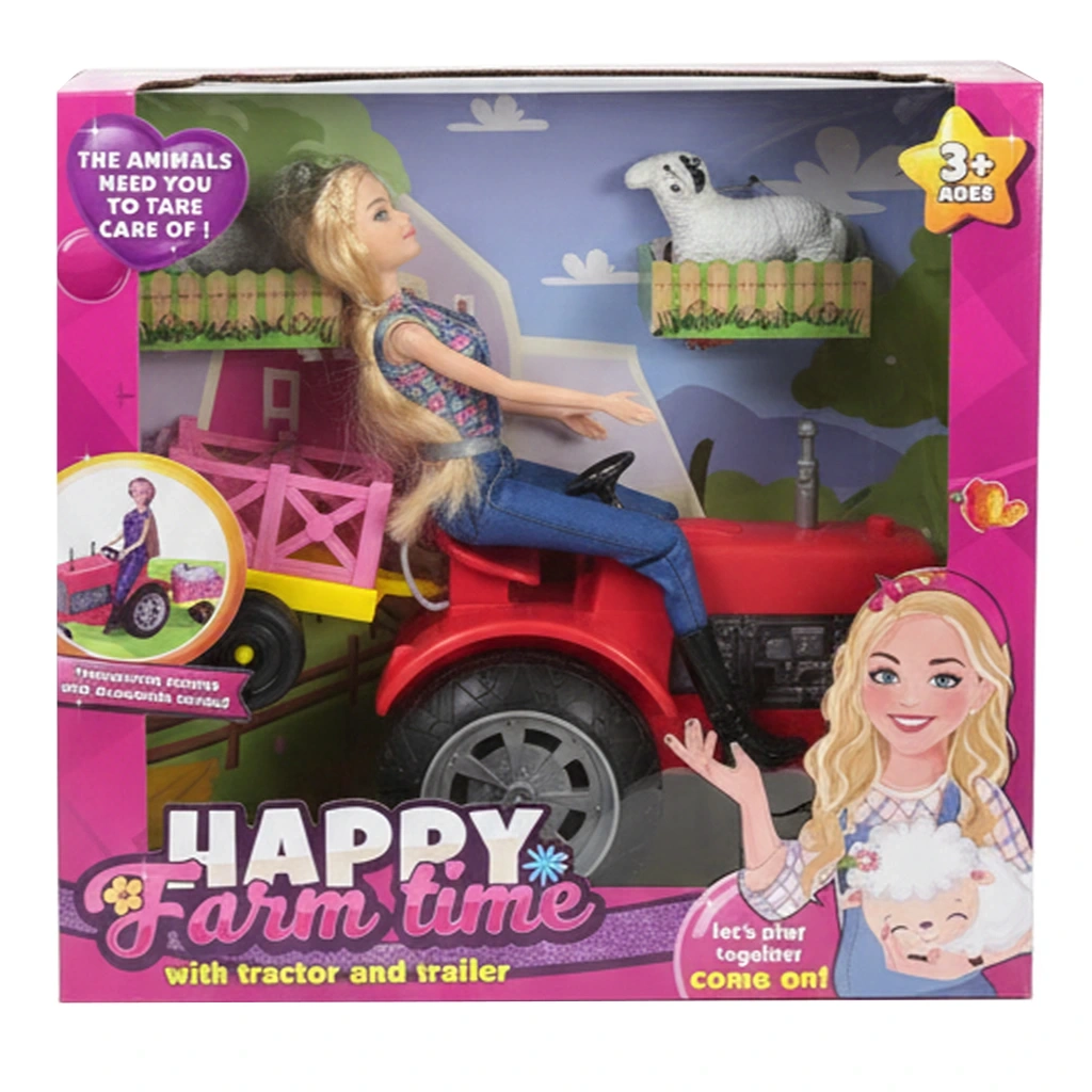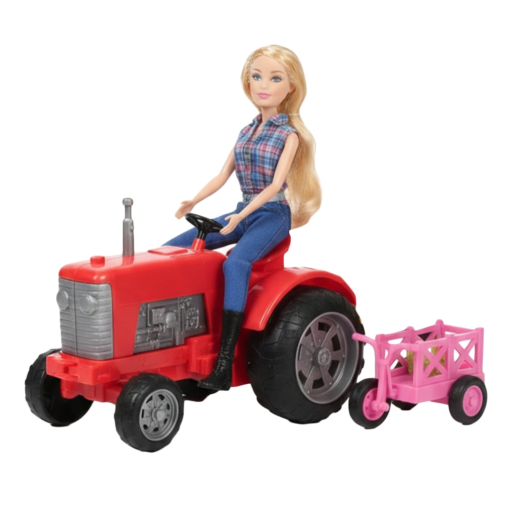 Traktör, römork ve barbie çiftçi figürü içerir
