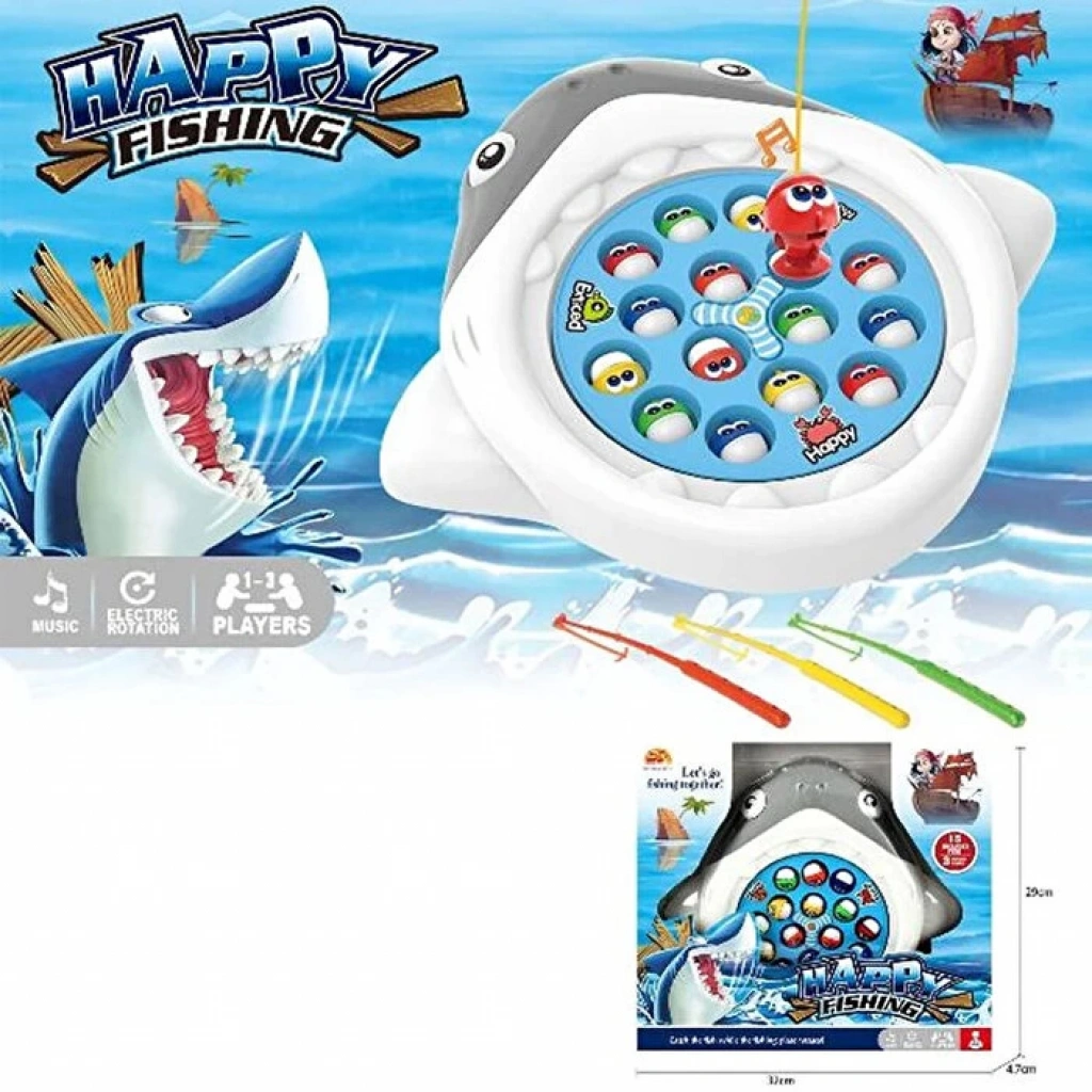 Eğlence, beceri ve müzik zevkini birleştiren, 3 yaş ve üzeri çocuklar için yaratıcı oyunları ve keyifli anları teşvik etmek için mükemmel olan bu elektrikli köpekbalığı temalı oyunla balık tutmanın heyecanını yaşayın.