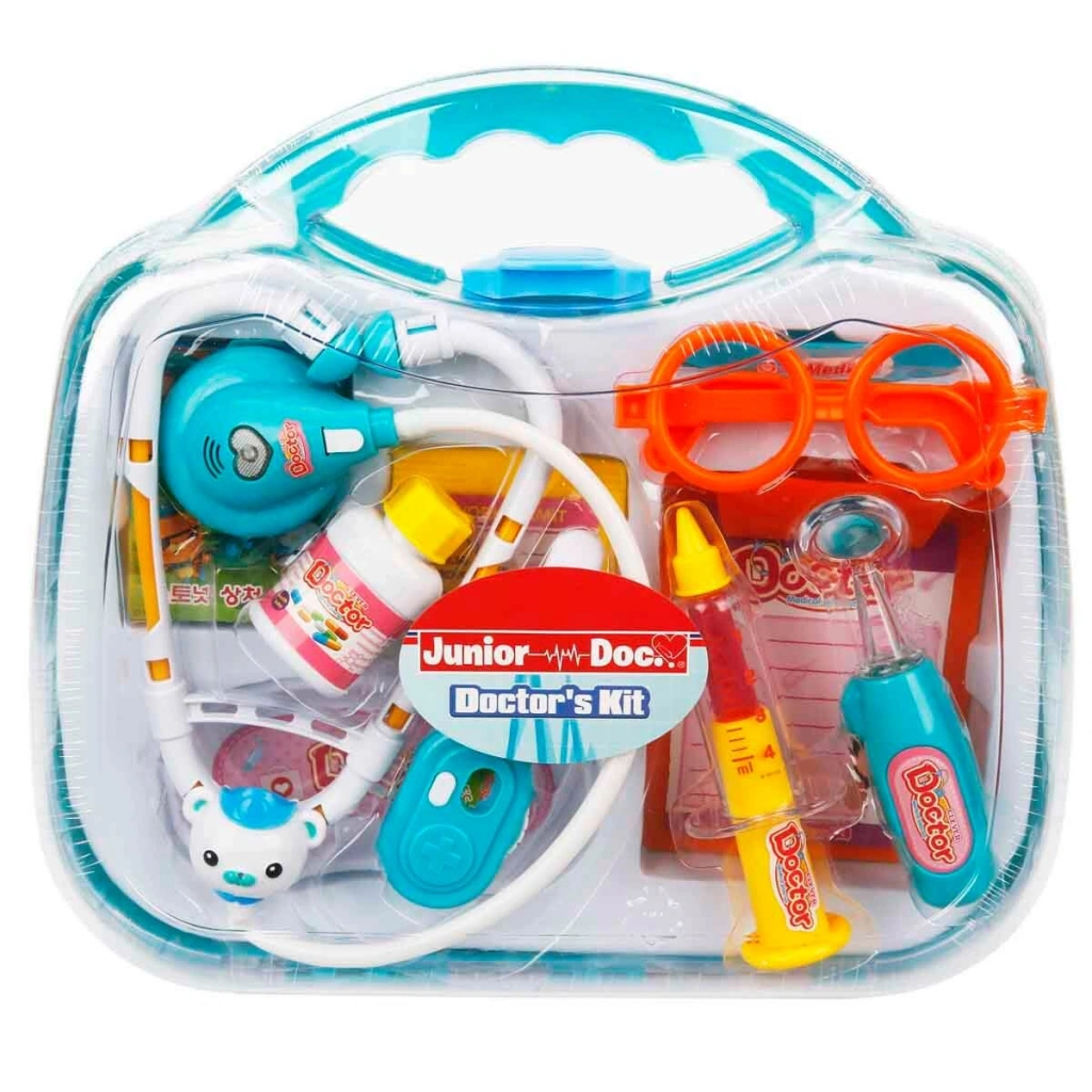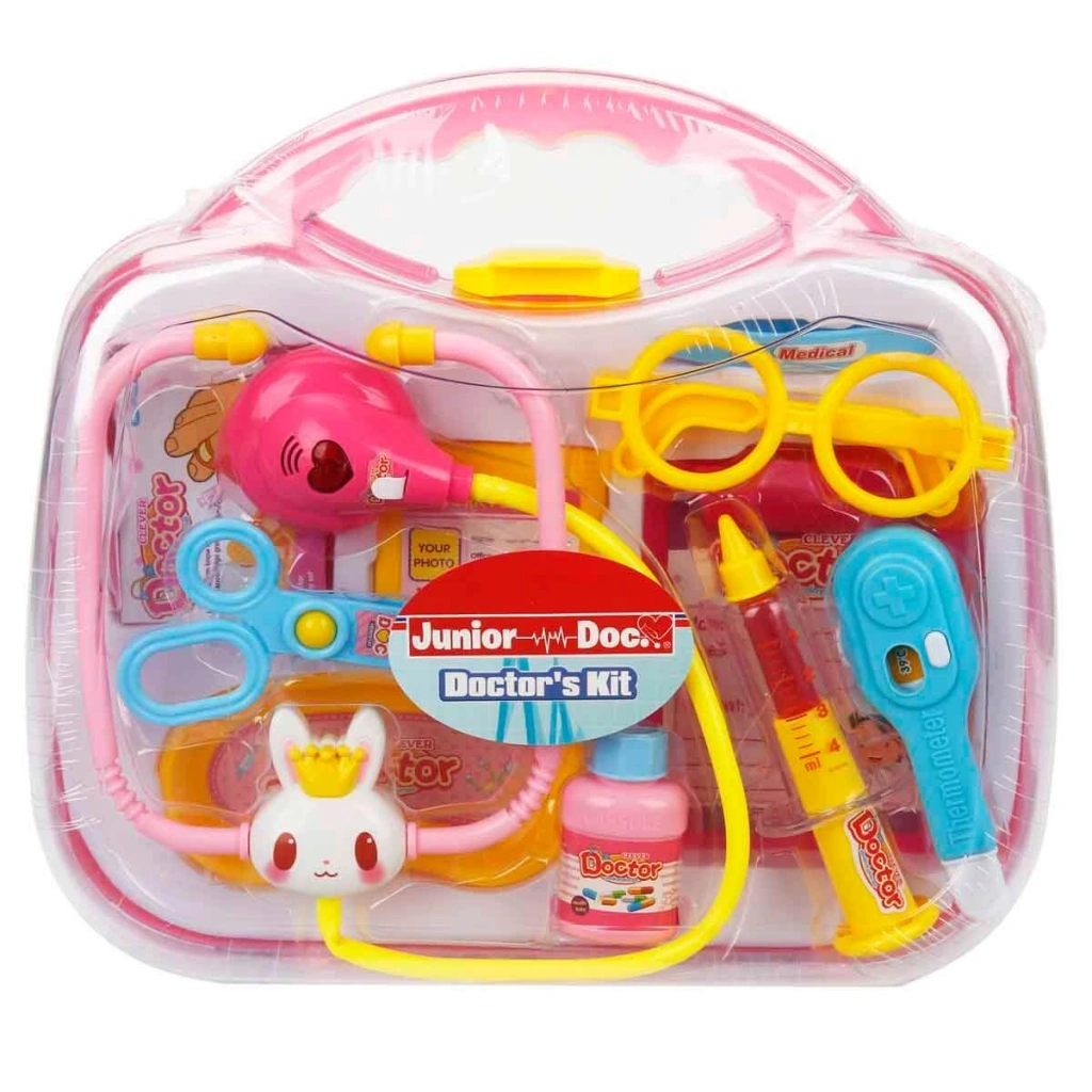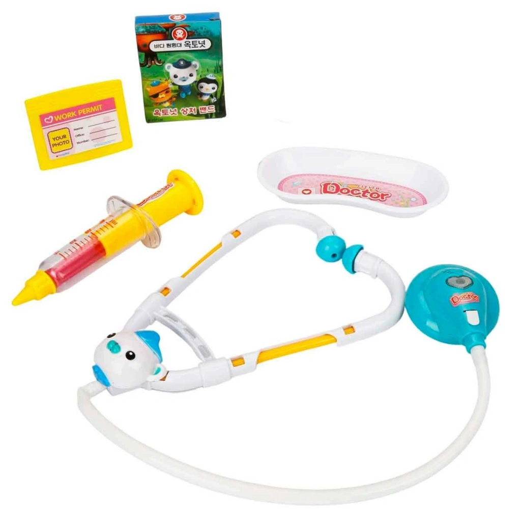Set içerisinde; doktor gözlüğü, doktor kimliği, yara bandı, iğne, stetoskop gibi çeşitli doktor malzemeleri yer almaktadır.