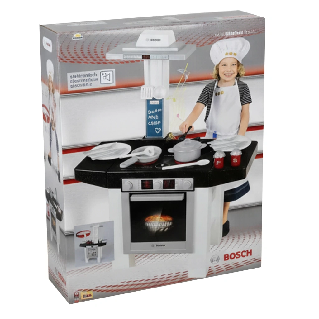 Klein Toys Bosch Mutfak Set Ocak/Fırın/Aspiratör Ocak, Fırın ve Aspiratörünüyle minik aşçılar için mutfağa girme zamanı! Bosch Fırın ve Ocaklı mutfak tezgahının sesli ve elektronik özellikleri bulunmaktadır. Ürünün içinde iki taraflı, elektronik pişirme sesi ve plakalar, mutfak eşyaları, tencere ve tava dahil çeşitli aksesuarlar yer almaktadır. Bu oyuncak Mutfak Seti’nin ocağı ve fırını ile çocuklar arkadaşlarını birbirinden güzel yemek hazırlayarak en güzel evcilik oyunlarını oynayabilecekler! Ayrıca bu mutfak seti ile artık sizde anneniz kadar hamaratsınız! Evde oyunlarla annelerini taklit eden küçük kızlar hem eğleniyor hem de annelerine yardım edecekler! Çocuklar orijinal Bosch tasarımlarını modellendiren unsurlara sahip olan bu büyük oyuncak Bosch Mutfak Seti ile en sevdikleri yemekleri hazırlamaktan ve sunmaktan keyif alacaklar. Çocukların